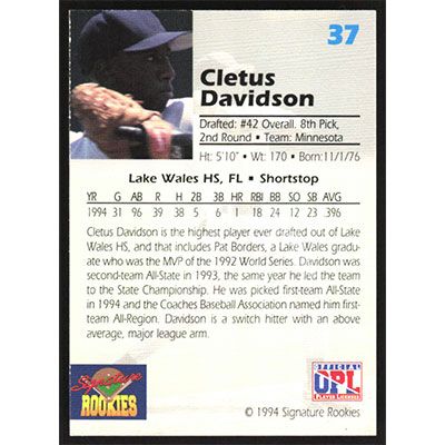 This is a 1994 Signature Rookies Draft Picks Cleatus Davidson baseball card. The card is #37 and pictures show condition. This card has an UER, with Davidson's name being misspelled as Cletus.