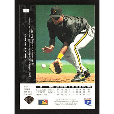 This is a 1994 SP Carlos Garcia baseball card. The card is #141 and pictures show condition.