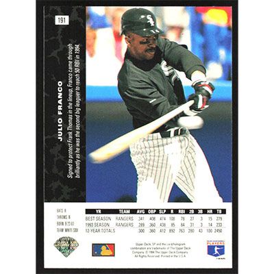 This is a 1994 SP Julio Franco baseball card. The card is #191 and pictures show condition.