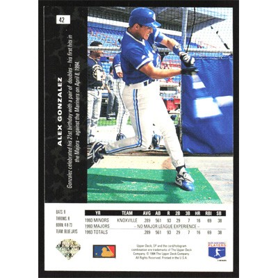 This is a 1994 SP Alex Gonzalez baseball card. The card is #42 and pictures show condition.