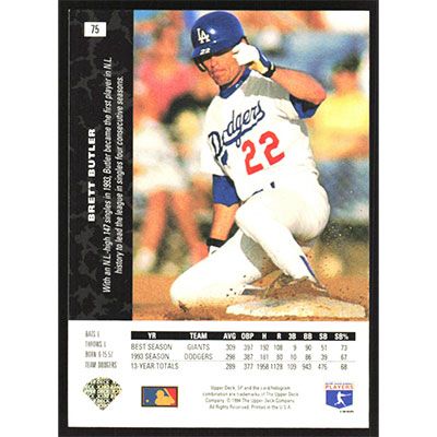 This is a 1994 SP Brett Butler baseball card. The card is #75 and pictures show condition.