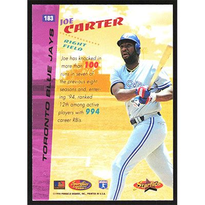 This is a 1994 Sportflics Joe Carter baseball card. The card is #183 and pictures show condition.