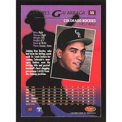 This is a 1994 Sportflics Andres Galarraga baseball card. The card is #55 and pictures show condition.