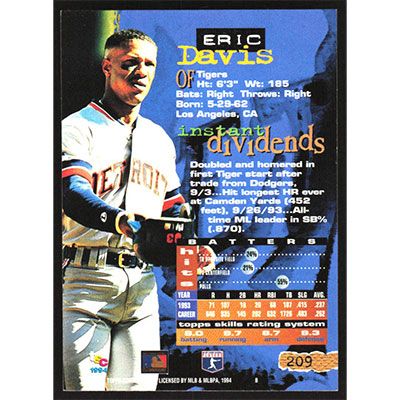 This is a 1994 Stadium Club Eric Davis baseball card. The card is #209 and pictures show condition.