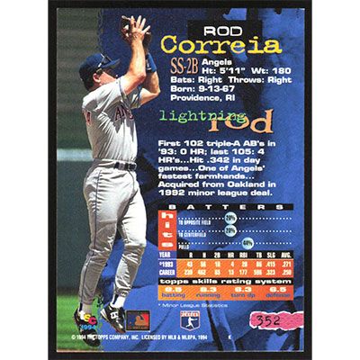 This is a 1994 Stadium Club Rod Correia baseball card. The card is #352 and pictures show condition.