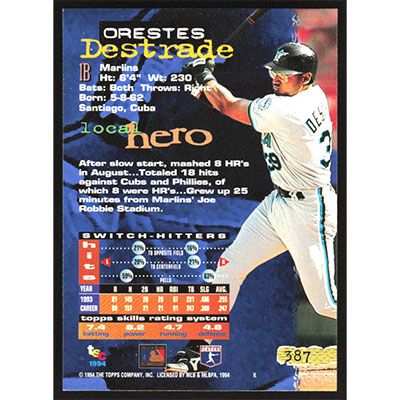 This is a 1994 Stadium Club Orestes Destrade baseball card. The card is #387 and pictures show condition.