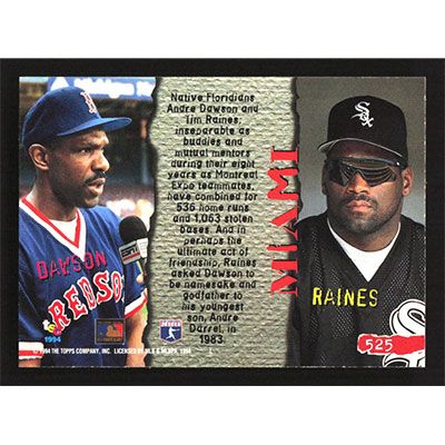 This is a 1994 Stadium Club Andre Dawson and Tim Raines Tale of 2 Players baseball card. The card is #525 and pictures show condition. Team(s): Boston Red Sox/Chicago White Sox