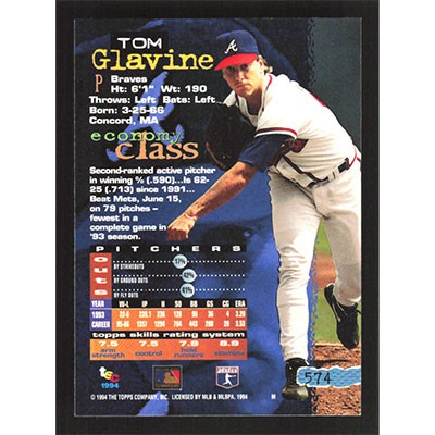 This is a 1994 Stadium Club Tom Glavine baseball card. The card is #574 and pictures show condition.