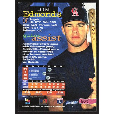 This is a 1994 Stadium Club Jim Edmonds baseball card. The card is #603 and pictures show condition.