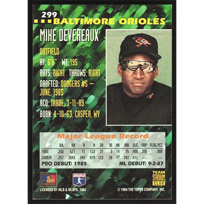 This is a 1994 Stadium Club Team Mike Devereaux baseball card. The card is #299 and pictures show condition.
