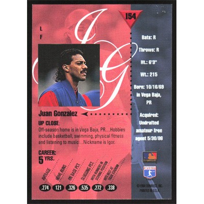 This is a 1994 Studio Juan Gonzalez baseball card. The card is #154 and pictures show condition.