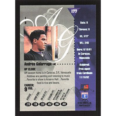 This is a 1994 Studio Andres Galarraga baseball card. The card is #177 and pictures show condition.