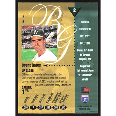 This is a 1994 Studio Brent Gates baseball card. The card is #2 and pictures show condition.
