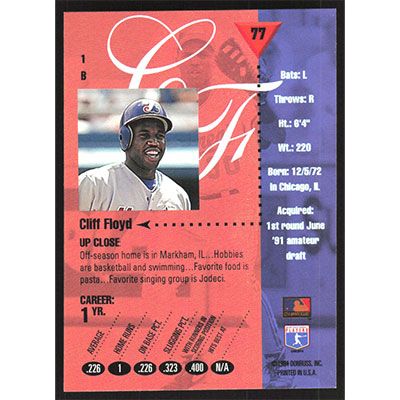 This is a 1994 Studio Cliff Floyd baseball card. The card is #77 and pictures show condition.