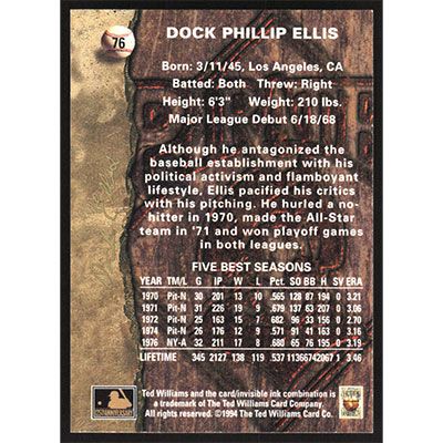 This is a 1994 Ted Williams Dock Ellis baseball card. The card is #76 and pictures show condition.