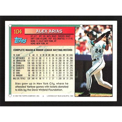 This is a 1994 Topps Alex Arias baseball card. The card is #104 and pictures show condition.
