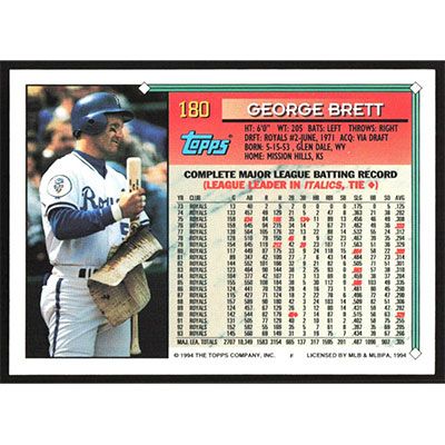 This is a 1994 Topps George Brett baseball card. The card is #180 and pictures show condition.
