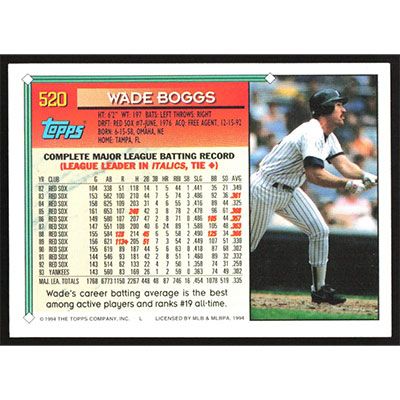 This is a 1994 Topps Wade Boggs baseball card. The card is #520 and pictures show condition.