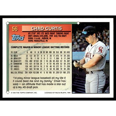 This is a 1994 Topps Chad Curtis baseball card. The card is #56 and pictures show condition.