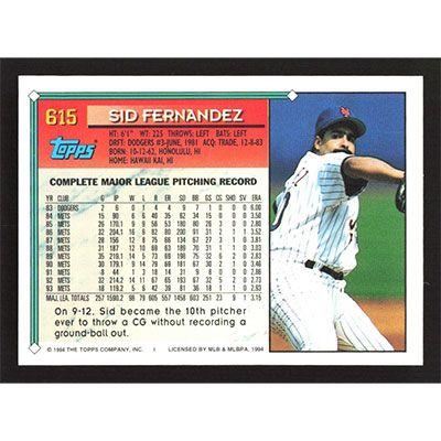 This is a 1994 Topps Sid Fernandez baseball card. The card is #615 and pictures show condition.