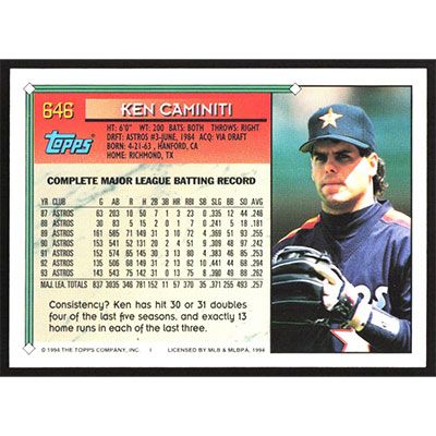 This is a 1994 Topps Ken Caminiti baseball card. The card is #646 and pictures show condition.