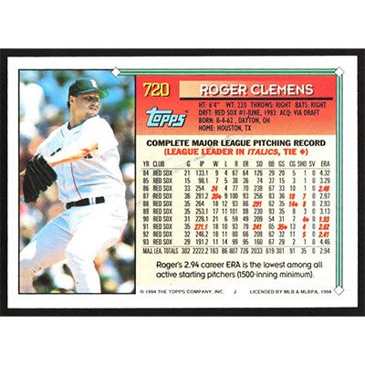 This is a 1994 Topps Roger Clemens baseball card. The card is #720 and pictures show condition.