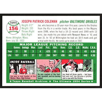 This is a 1994 Topps Archives 1954 Joe Coleman baseball card. The card is #156 and pictures show condition.
