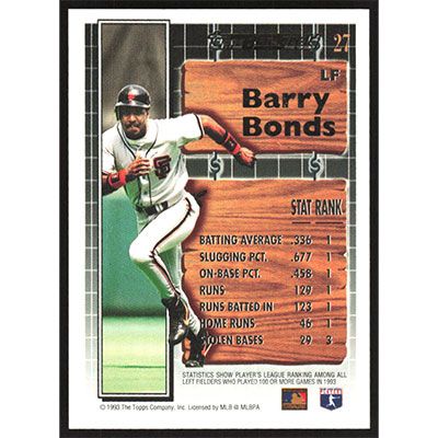 This is a 1994 Topps Black Gold Barry Bonds baseball card. The card is #27 and pictures show condition.