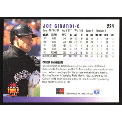This is a 1994 Triple Play Joe Girardi baseball card. The card is #224 and pictures show condition.
