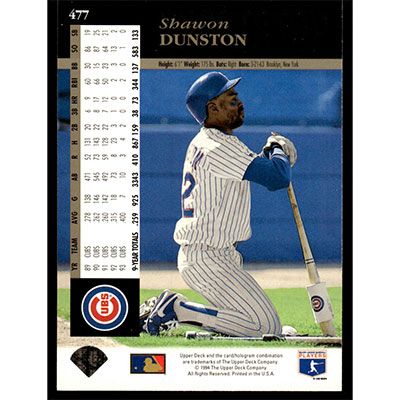 This is a 1994 Upper Deck Shawon Dunston baseball card. The card is #477 and pictures show condition.