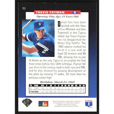 This is a 1994 Upper Deck Travis Fryman The Future is Now 25 baseball card. The card is #51 and pictures show condition.