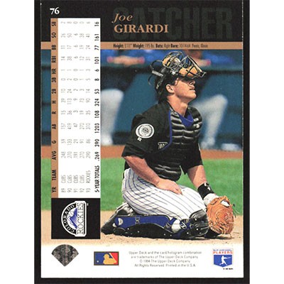 This is a 1994 Upper Deck Joe Girardi baseball card. The card is #76 and pictures show condition.