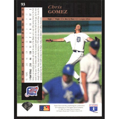 This is a 1994 Upper Deck Chris Gomez baseball card. The card is #93 and pictures show condition.