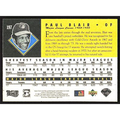 This is a 1994 Upper Deck All-Time Heroes Paul Blair baseball card. The card is #197 and pictures show condition.