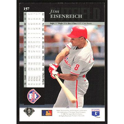 This is a 1994 Upper Deck Electric Diamond Jim Eisenreich baseball card. The card is #157 and pictures show condition.