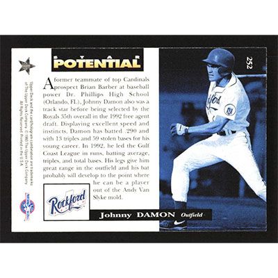 This is a 1994 Upper Deck Minors Johnny Damon Star Potential Foil baseball card. The card is #252 and pictures show condition.