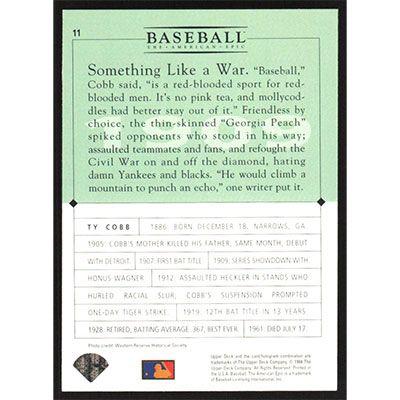 This is a 1994 Upper Deck: The American Epic Ty Cobb baseball card. The card is #11 and pictures show condition.