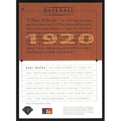 This is a 1994 Upper Deck: The American Epic Rube Foster baseball card. The card is #31 and pictures show condition.