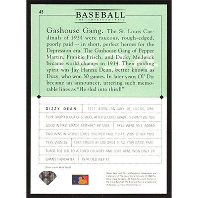This is a 1994 Upper Deck: The American Epic Dizzy Dean baseball card. The card is #45 and pictures show condition.