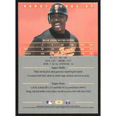 This is a 1995 Bowman's Best Barry Bonds baseball card. The card is #13 and pictures show condition.