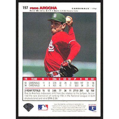 This is a 1995 Collector's Choice Rene Arocha baseball card. The card is #197 and pictures show condition.