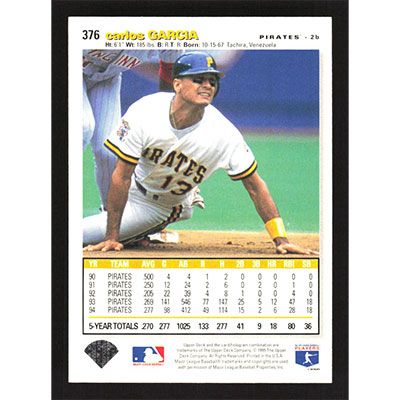 This is a 1995 Collector's Choice Carlos Garcia baseball card. The card is #376 and pictures show condition.