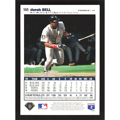 This is a 1995 Collector's Choice SE Derek Bell baseball card. The card is #165 and pictures show condition.