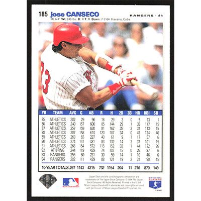 This is a 1995 Collector's Choice SE Jose Canseco baseball card. The card is #185 and pictures show condition.
