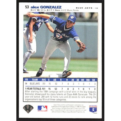 This is a 1995 Collector's Choice SE Alex Gonzalez baseball card. The card is #53 and pictures show condition.