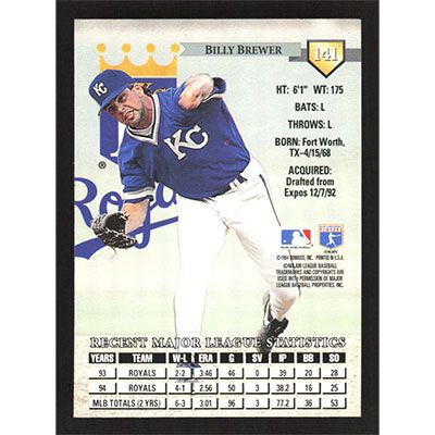 This is a 1995 Donruss Billy Brewer baseball card. The card is #141 and pictures show condition.