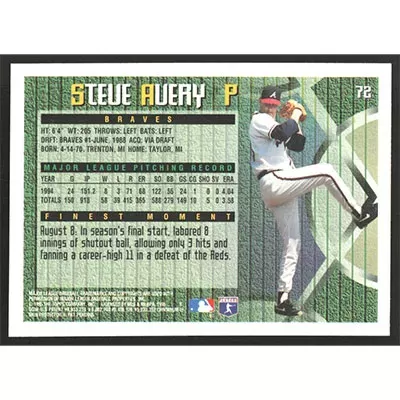 This is a 1995 Finest Steve Avery baseball card. The card is #72 and pictures show condition.