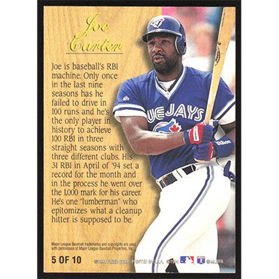 This is a 1995 Fleer Lumber Company Joe Carter baseball card. The card is #5 and pictures show condition.