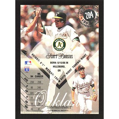 This is a 1995 Leaf Scott Brosius baseball card. The card is #204 and pictures show condition.