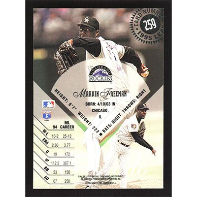 This is a 1995 Leaf Marvin Freeman baseball card. The card is #259 and pictures show condition.